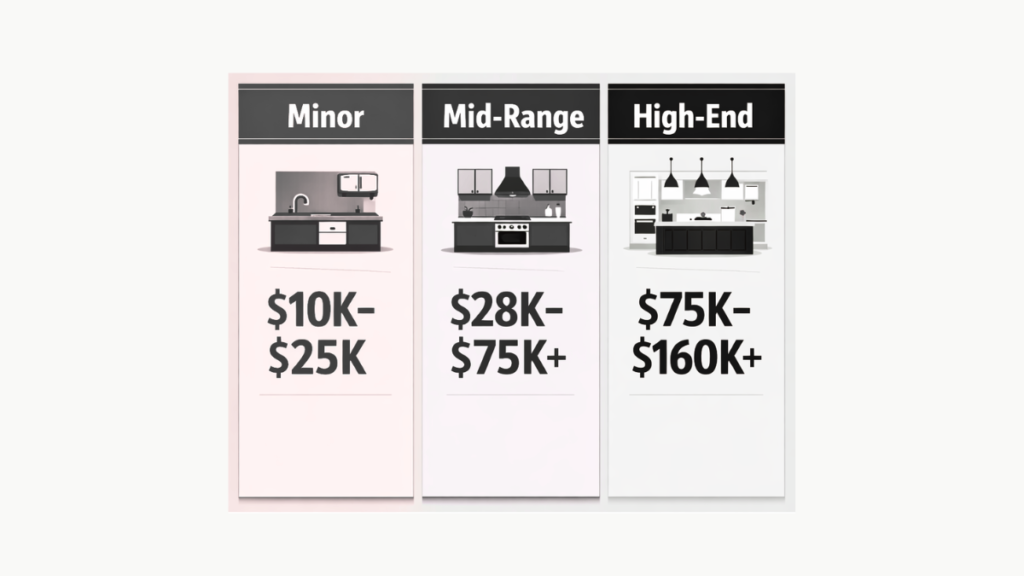 High-End/Custom Remodel ($75,000-$160,000+): Complete kitchen renovation with high-end materials, custom cabinets, premium appliances, and extensive layout modifications.